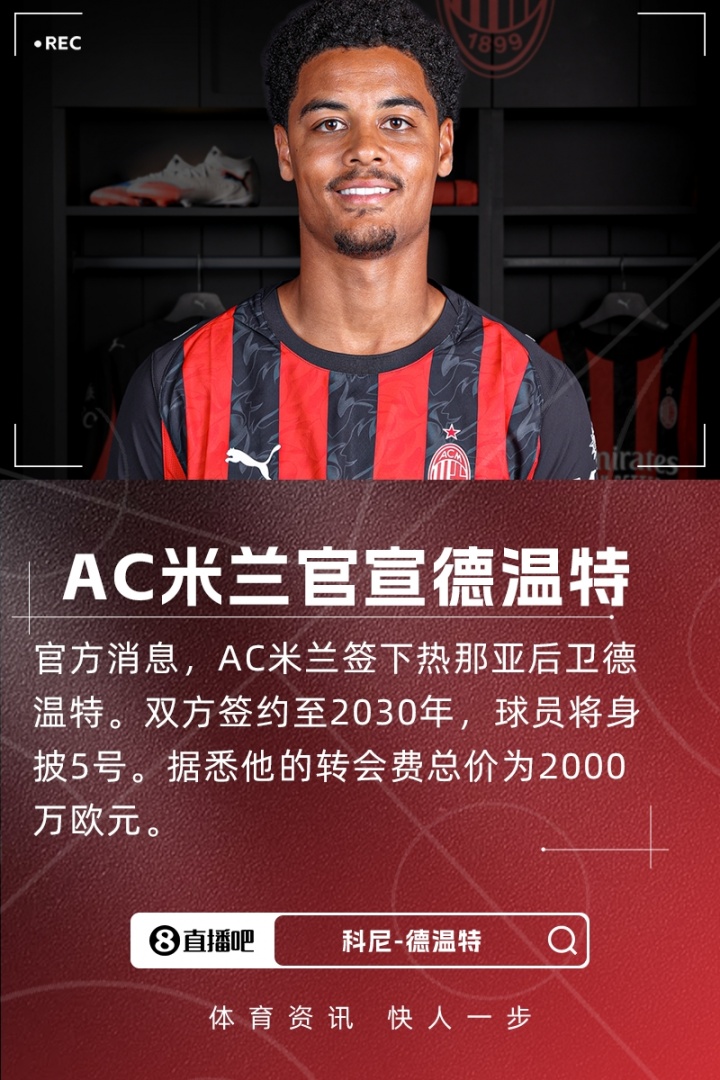 8月13日官方确认,AC米兰成功引进热那亚后防球员德温特,合约期至2030年,新赛季他将身穿5号战袍。知名记者罗马诺透露,这笔交易总金额达到2000万欧元。...